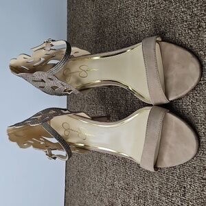 Jessica Simpson Hipp Taupe Faux Suede Sparkly Rhinestones Strappy Heels Sz 9.5