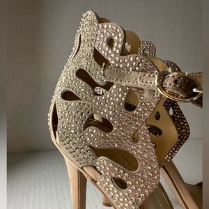 Jessica Simpson Hipp Taupe Faux Suede sparkly Rhinestones Strappy Heels unsure of Size