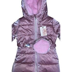 Charm pink hooded puffer coat. Belt with pouch. Full zip. Side pockets. Faux fur hood. Sit at hip. 100% polyester. Size: 4T. NWT.
