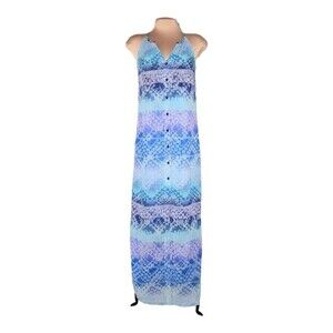 Jessica Simpson Hyacinth Blue Halter Top Button Front Maxi Dress Size XS. This long and cool maxi dress features a halter neckline and buttons down the front. The fabric, in different shades of blue, is 100% polyester and it is lined from the top down to about the knees after which it is sheer. This dress is preowned but remains in good condition with no significant flaws identified except it is missing a belt compared to the first picture. Approximate measurements lying flat: armpit to armpit 16", length from collar to bottom hem 56".