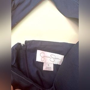 Dress is a grayish-navy with teal and light pink piping. Sewn-in bra cups and open back.