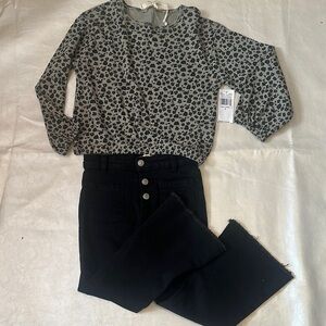 Stylish kids matching set by Jessica Simpson. Features a gray leopard print top. Paired with black flared pants. Perfect for a trendy look.