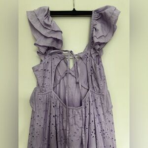 Elegant lavender maxi dress. Features ruffled sleeves and eyelet details. Perfect for any occasion.