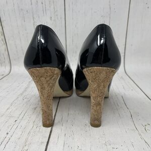 Jessica Simpson Leather Pumps Size 8.5 Black Cork High Heel Made In Brazil. Good Preowned Condition without box - ships in new box.