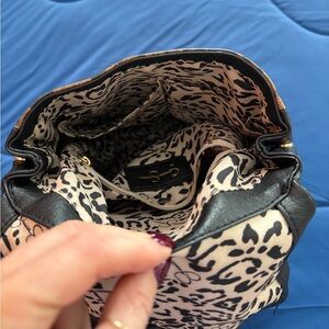 The Jessica Simpson Black and Leopard Print Purse is a stylish shoulder bag made from faux leather with a snap closure and zippered pocket. The exterior color is black with leopard print accents, adding a playful touch to the design. This purse is perfect for women who want to make a statement with their handbag, offering both fashion and functionality in one chic accessory.