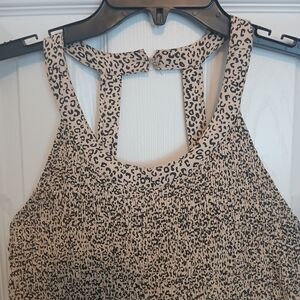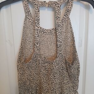 Stylish leopard print jumpsuit. Sleeveless design with pockets. Perfect for any occasion.