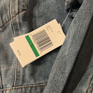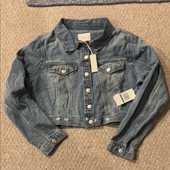 Chic denim jacket with button closure. Features classic collar and front pockets.