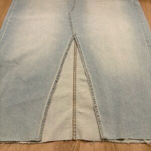 Stylish light blue denim midi skirt with front slit. Perfect for casual outings.