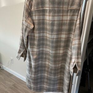 Long flannel jacket, soft with pattern of grey, cream, and camel. Top pockets with flaps, side splits, cuffed sleeves with buttons and antique silver buttons down front. I worn this once. Excellent condition.