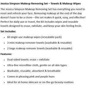 The Jessica Simpson Makeup Removing Set has everything you need to reset and refresh your face. Removing makeup at the end of the day doesn’t have to be a chore—this set makes it quick, easy, and effective! Perfect for daily use or travel, the kit includes wipes and reusable towels designed to erase, exfoliate, and keep your skin feeling fresh.