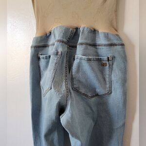 Very cute maternity jeans in a light wash stretchy Denim with full panel belly band and some distressing as well as a grayed hem. Great condition. Size small, measures approximately 33 inches long 29 waist 26 inseam. Please note measurements do not include belly band, measures denim only.