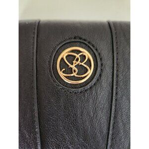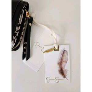 Wallet in the Color black features a round gold-toned logo with JS in center, 2 curved faux leather accents on front of wallet.
