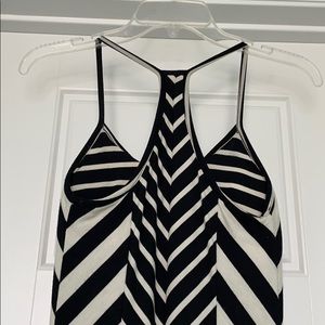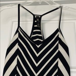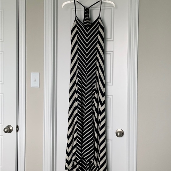 This monochrome maxi dress has a hi-low design and it’s made out of very comfortable fabric. The back of the dress has a racer back design. It also has a built-in shelf bra with padding. Only worn a couple of times. It is in decent condition. Some pilling. I’m just a short girl who tries to wear long dresses.