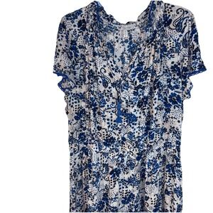 The Jessica Simpson maxi dress in size 3X features a blue and white floral pattern with tie tassels, making it perfect for a party or casual occasion. This dress has a V-neckline, short sleeves, and a pullover closure for easy wear. Made from viscose knit fabric, it offers a comfortable and elegant fit for the season. With accents like smocking, and tiered details, this dress exudes a stylish and feminine look.