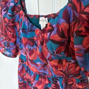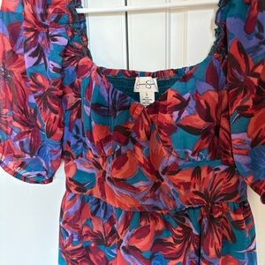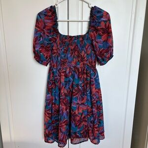 Vibrant floral dress with puff sleeves. Features a mix of red and blue colors. NWOT
