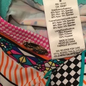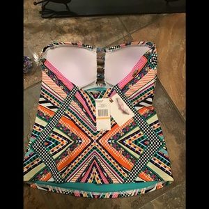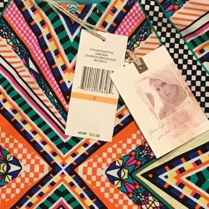 Vibrant geometric pattern. Strapless design. Eye-catching style.
