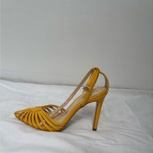 Chic mustard heels with strappy design. Ideal for stylish outings.