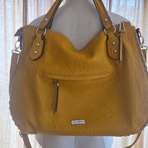 This stylish yellow shoulder bag by Jessica Simpson features durable handles and decorative hardware. It includes a front zip pocket and a spacious interior, perfect for everyday use. Size is 17x12