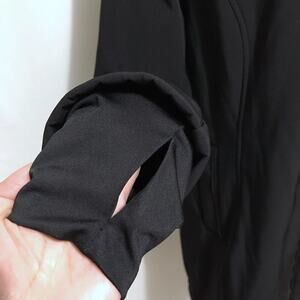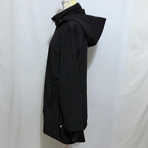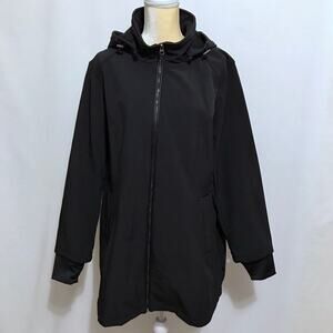 NWOT. Black Softshell Trench Coat for Women Size 1X. Zipper for closure, long sleeves with extended cuffs with thumb holes, removable hood with zipper, 2 pockets with zipper only for style, fleece lined interior. Pictures are part of description.