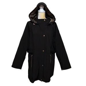 NWOT. Black Softshell Trench Coat for Women Size 1X. Rose gold zipper and snap buttons for closure, long sleeves, 2 pockets with zippers for closure, faux side belted style, non-removable hood with leopard print lining and adjustable strap, fleece lined interior, patch brand logo left sleeve. Pictures are part of description.