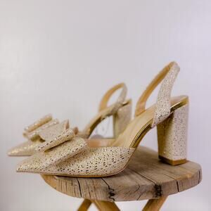 Jessica Simpson Nekira 3 Bow Evening Heels Pumps Natural Gold Shoes Size 9 NEW