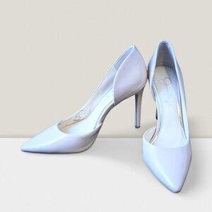 Elevate any outfit with these nude pointed heels by Jessica Simpson! Sleek patent leather adds a polished, sophisticated touch, perfect for work, nights out, or special occasions.