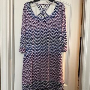 Stylish dress with a purple and blue pattern. Features a unique back design. EUC smoke free/ pet friendly home