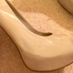 Beige/off white heels with patent leather front, open toe and suede back and heels. More off white coloring with grayish tint than nude. Hard to picture with lighting. Slight damage pictured.