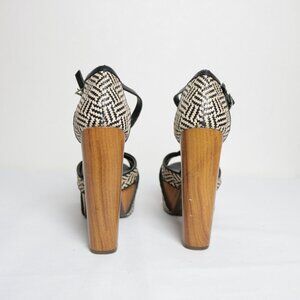 Jessica Simpson Peep Toe Platform Wooden Chunky Heels with black off-white tribal striped boho woven pattern.