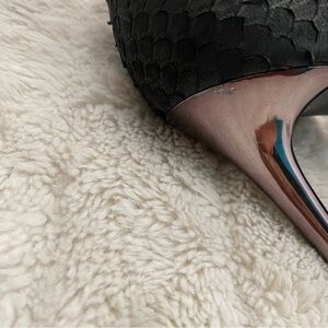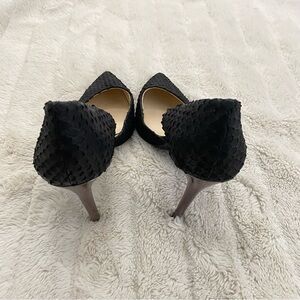 Stylish curvy open side black heels by Jessica Simpson with a sleek metallic rose gold stiletto. Perfect for the office or a night out.