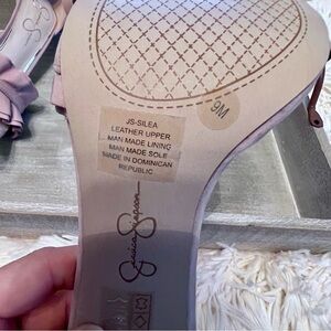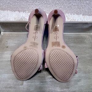 Elegant lavender/baby pink heels with ruffle detail. Ankle strap with buckle closure. Perfect for any occasion. Too small for me.