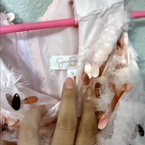 Charming pink dress with shimmering sequins. Perfect for formal occasions. Sleeveless design with a fluffy skirt.