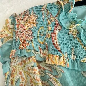 This elegant sundress by Jessica Simpson features a captivating blue color palette, perfect for a brunch or resort wear. The dress boasts a ruffled, tiered high-low design with a flattering V-neck and flutter cap sleeves. A tie front detail adds a touch of sophistication to this airy and stylish piece. Fully lined. Elastic waist.