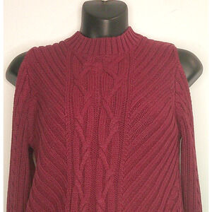 The Jessica Simpson Posy Cold Shoulder Sweater in Size S is a stylish maroon tunic-length sweater perfect for casual occasions. Made from a blend of cotton and acrylic, this cable-knit sweater features a mock neck and long cold-shoulder sleeves, giving it a trendy and comfortable look. The regular fit and solid pattern make it a versatile piece that can be easily paired with different outfits for a chic and fashionable ensemble.