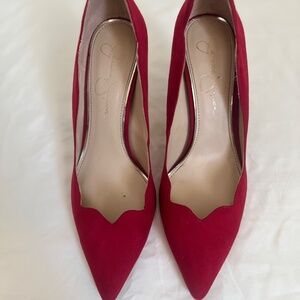 These “Eyes on me Red” are styled with a pointed toe and slim heel. The scallop detail gives an elegant look whether you pair them with jeans, a dress or skirt.