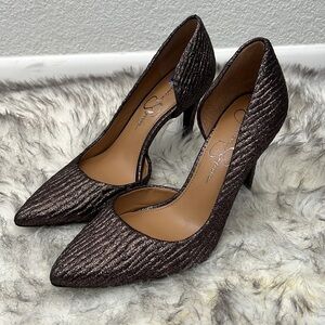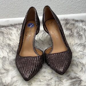 Shine brighter than the rest in this Jessica Simpson Prizma pump. Dress shoe features a shimmering textile upper. Easy slip-on styling. Soft leather lining. Lightly cushioned footbed. Wrapped heel. Durable man-made sole.Imported.