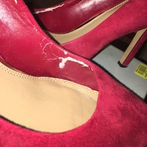 Cute Jessica Simpson Heels! Definitely can be paired with a business suit or business casual wear. Low heel (maybe 3"). Ruby Red Color. Tip still in the heel securely. There are some cracks from wear on the inside of shoe but it's not visible once the shoe is on. Good steal for anyone trying to build up their business casual closet!! Make me an offer 🤗