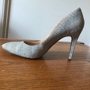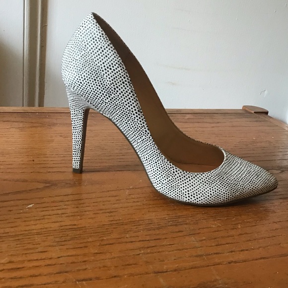 white leather pumps with textured black polka dots, 4” heels, Size 10. Lightly worn, in great condition.