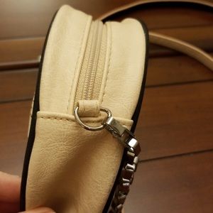 Nude and black colored round design purse. Wear as a crossbody. Good condition, few little smudges noted in pics. Inside is immaculate! Measure 6.5” round, 2” wide” and strap is 22.5 inches