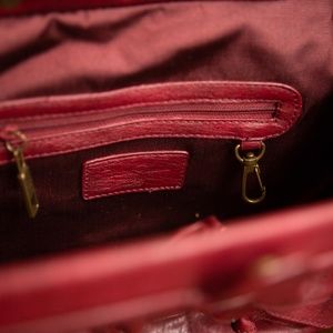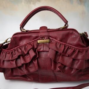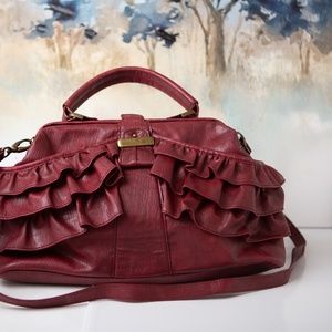 Such a cute Jessica Simpson Purse. It is a burgundy red with handle on top and shoulder strap. Inside is one zippered pocket and two regular pockets. The sides of the bag where the ruffles are also have slide in pocket space.