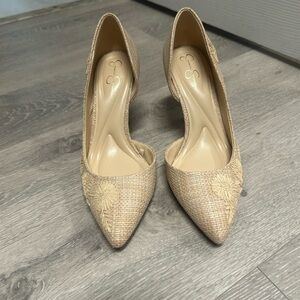 From Jessica Simpson, the Prizma Raffia D'Orsay Pumps feature: