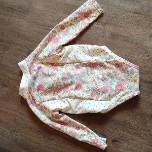 Light wear, great condition...wadhed (delicate/sensitive detergent)! Very pretty pastel floral and polka dot mixed print (very pale yellow w/ black dots...floral shades are yellows, pinks, greens)...zip at chest, 3 snaps for easy diaper changes...ling sleeves help protect from sun...size 12 months