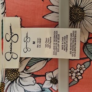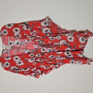 Bright and feminine Jessica Simpson floral kimono-style blouse in a bold red background with large white daisy flowers and green accents. Designed with a deep V-neckline, adjustable drawstring waist for a flattering fit, and flowy flutter sleeves with ruffle trim. The lightweight 100% rayon fabric drapes beautifully, making it perfect for layering.