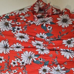 Vibrant red kimono blouse with floral pattern. Features a flowy design and ruffled edges. Ideal for casual outings.