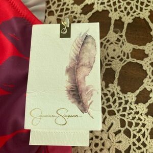 Dive into style with this Jessica Simpson one-piece swimsuit, showcasing a vibrant red and pink tie-dye pattern. The classic V-neck design and stretchy material ensure a comfortable fit, while the eye-catching colors make a bold statement at the beach or pool.