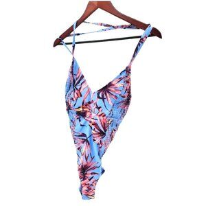This one-piece swimsuit channels playful tropical energy with a modern resort aesthetic. The smocked side panels create a flattering silhouette that hugs curves while offering subtle texture and detail. A vibrant palm-inspired floral print evokes islandcore and jet-set glamour, balanced by a V-neckline and softly structured removable cups for comfort and shape. The U-back design with adjustable crisscross ties adds both support and an elegant finish, while moderate bottom coverage ensures easy wear. Fully lined for a smooth fit, it captures wanderlust style, perfect for vacations, poolside lounging, or beach days. A striking piece that combines fashion-forward appeal with timeless swimwear.