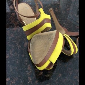 Brown leather and yellow suede sandals. Size 8.5 with 4" heel. Worn once