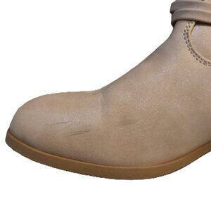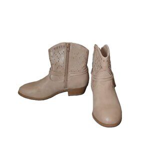 This is a pair of beige kids short cowboy boots. They have sparkles all over with a cutout diamond pattern and rhinestone on the outside. They are a size 4 (UK 2.5), but are on the larger side of the size. The insole is 9 inches long and 3 inches wide. The heal is 1 inch tall, and the boots are 7.5 inches tall. The boots are in good condition, only worn a handful of times. The bottoms are dirty and there are some scratches on the inside of the right shoe. They are made out of man made materials.