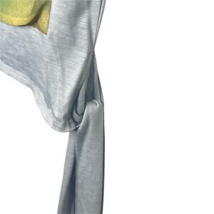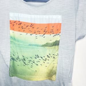 Jessica Simpson Short Sleeve Side Tie Blouse Beach Bird Graphic Size XS. Super soft gray short cap sleeve t shirt top with a colorful beach scene and birds flying through the air. Scoop neck. Cute tie on the side.