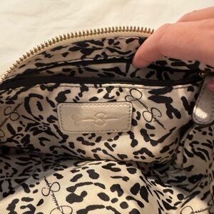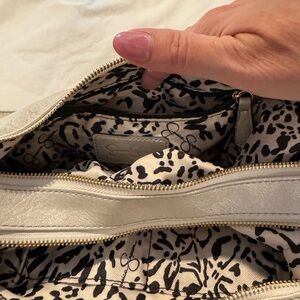Stylish silver hobo bag with unique stitching. Adds elegance to any outfit.